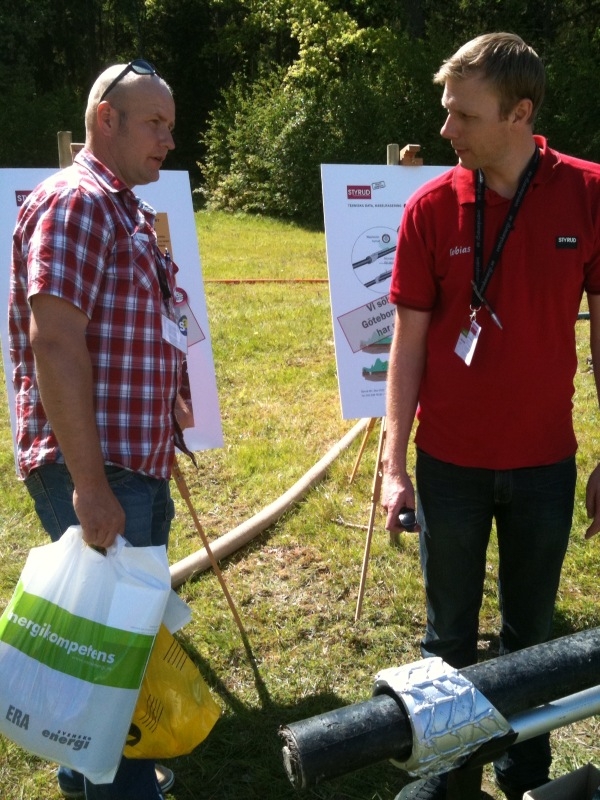 Peter Isaksson vid StyroRocken pratar med en besökareTobias Wingqvist (th) beskriver Styruds metod för kabelrasering