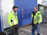 En container placerades framför mottagningsgropen, där piloten gjort genomslag och med hjälp av 6 grävmaskiner lyftes rören upp på taket till containern. En svetsrulle placerad på kanten till containerns tak underlättade matningen och förhindrade att rörets mantel skrapades. Lösningen med att använda en container för att få höjd, var mycket mer effektiv än både sandhögar och maskiner stand by. Det innebar också en avsevärt skonsammare hantering av asfaltsytan.