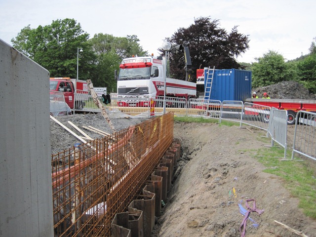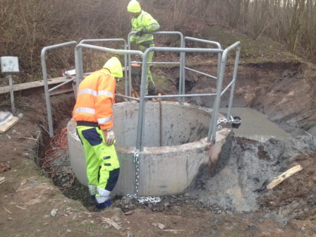 En av åtgärderna var att anlägga en pumpstation, ett ”mellanlager” för vattnet som inte hinner rinna undan. En liten bit ifrån järnvägsviadukten har en rejäl sänkbrunn anlagts,8 meterdjup och med en diameter på 4,5m. Betongsegmenten gjuts på plats och sänks av sin egen tyngd allteftersom jordmassorna innanför grävs undan. Längst ned gjöts en bottenplatta, där en pumpanläggning placeras. Från sänkbrunnen har det gjorts en betongrörstryckning på ca 60 meter upp till dagvattenbrunnarna i vägsvackan under spåren och ytterligare ett rör har lagts från nya sänkbrunnen med mynning i Säveån – det rör som ska leda vattenmassorna ut mot ån, när det blir plats över att leda bort vattnet.