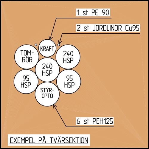 Tre veckor tog jobbet med att borra och installera skyddsrör. Hela knippen av PEH-rör drogs, med varierande antal på olika delsträckor. Som mest 6-7 rör i stöten.